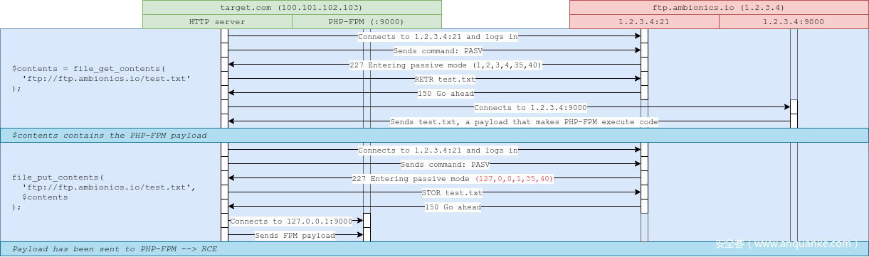 我们将使用 PASV 来使 file_get_contents() 在恶意服务器上下载文件,并且当它尝试使用 file_put_contents() 将其上传回时,我们让它发送文件到 127.0.0.1:9000 (本地有 php-fpm 服务,可以实现稳定 RCE ),实际上,get 所做的只是为了代替引题的 data 传送 payload 。