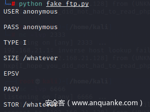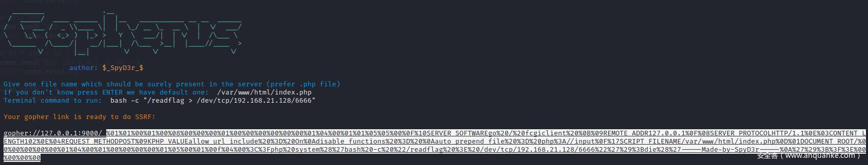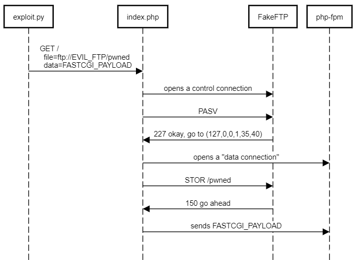 file_put_contents() 用 ftp:// 与我们的恶意服务器建立控制连接,使目标发送 PASV 命令,我们“被动”提供 ip 端口至本地 9000 端口,然后建立起数据连接,将 data (fastcgi payload)的内容上传到服务器,最后只需攻击机监听 payload 给定的端口获取 /readflag 执行结果即可。