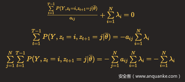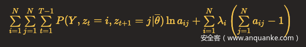 状态转移概率矩阵中每一行的元素之和为1,所以可以利用具有约束条件的拉格朗日乘子法,这里N代表隐含状态总数。