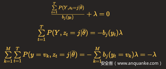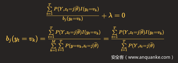 每种状态的发射概率之和为1,同样利用拉格朗日乘子法,这里M表示观测集合元素总数,v_k表示观测状态。