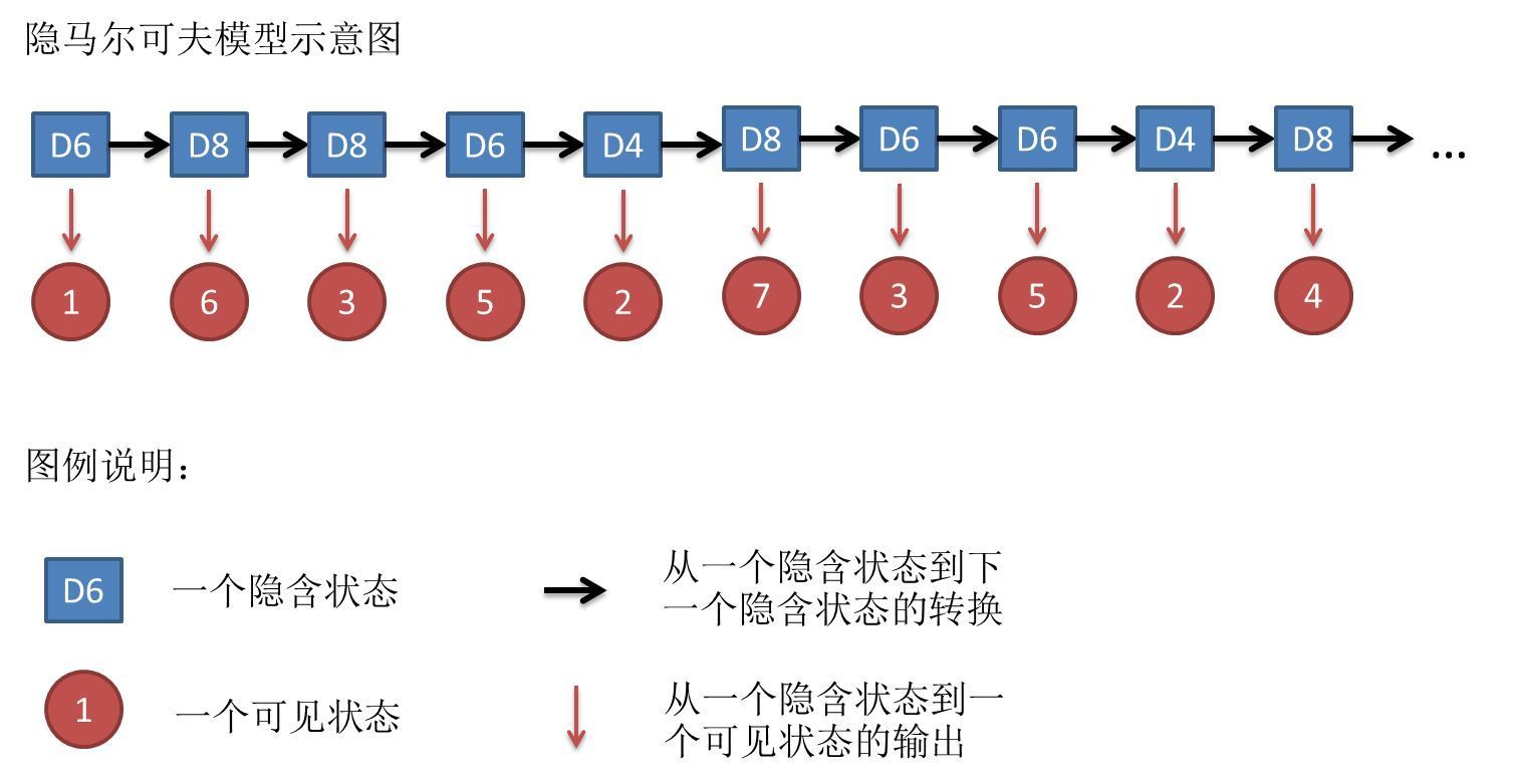 相当于,你知道骰子有几种(状态集合),每种骰子是什么样的(状态转移矩阵),根据骰子抛出的结果(观测序列),可以计算出每次抛的是哪种骰子(隐含状态序列)。
