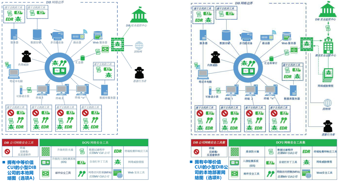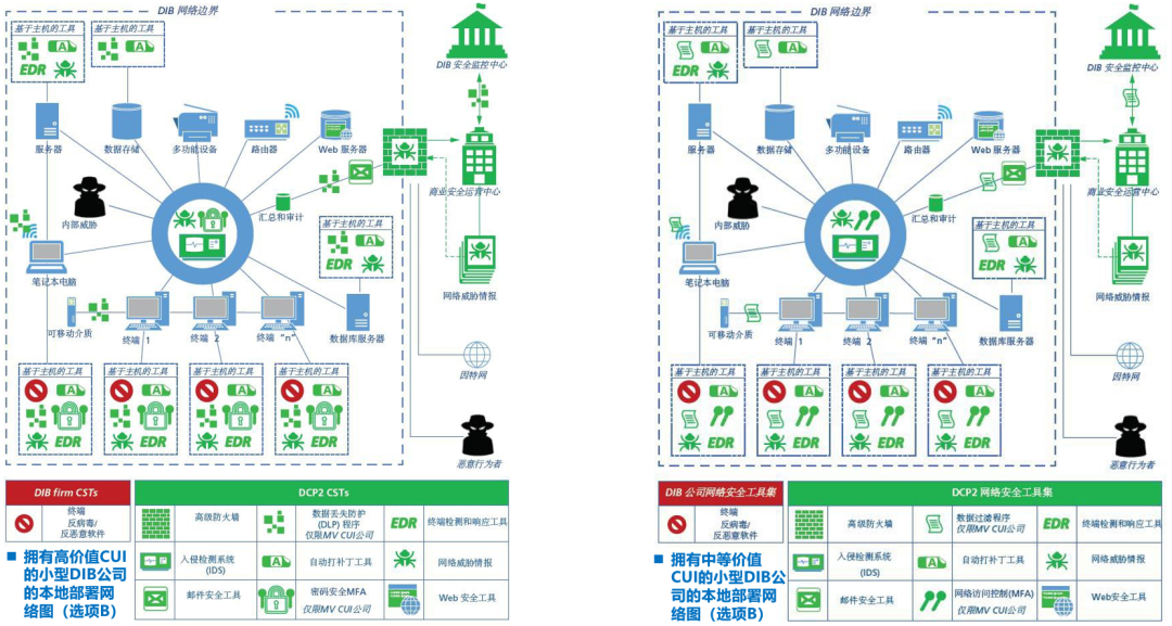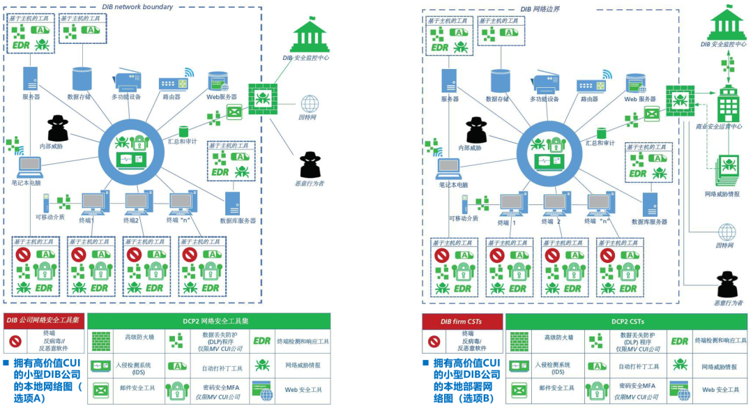 图8-小型DIB公司的本地网络(选项A):拥有高价值CUI vs. 中等价值CUI如图所示,由红色标记的DIB公司自购的网络安全工具非常少,这是现状;而绿色标记的DCP2网络安全工具就非常多,极大补充了DIB小型公司的安全能力。这也正是国防工业基础网络保护计划(DCP2)的目的所在。前面提到,大多数DIB小型公司,通常缺少安全运营中心(SOC)和内部SIEM能力。而通过参与国防工业基础网络保护计划(DCP2),DIB小型公司将可以由一个集中式的DIB安全运营中心(SOC)提供SIEM功能,从而具备了一些要求最高、劳动力最密集的网络安全功能:如威胁分析、数据关联、数据汇总、警报分类。上面左、右两图的主要区别在于:在访问控制方面,右侧的中价值公司采用了常见的网络访问控制(MFA),而左侧的高价值公司则采用了密码安全MFA,提高了安全标准;此外,在数据安全方面,右侧的中价值公司采用了数据过滤程序,而左侧的高价值公司则采用了DLP(数据防泄漏),也提高了安全标准。![]()