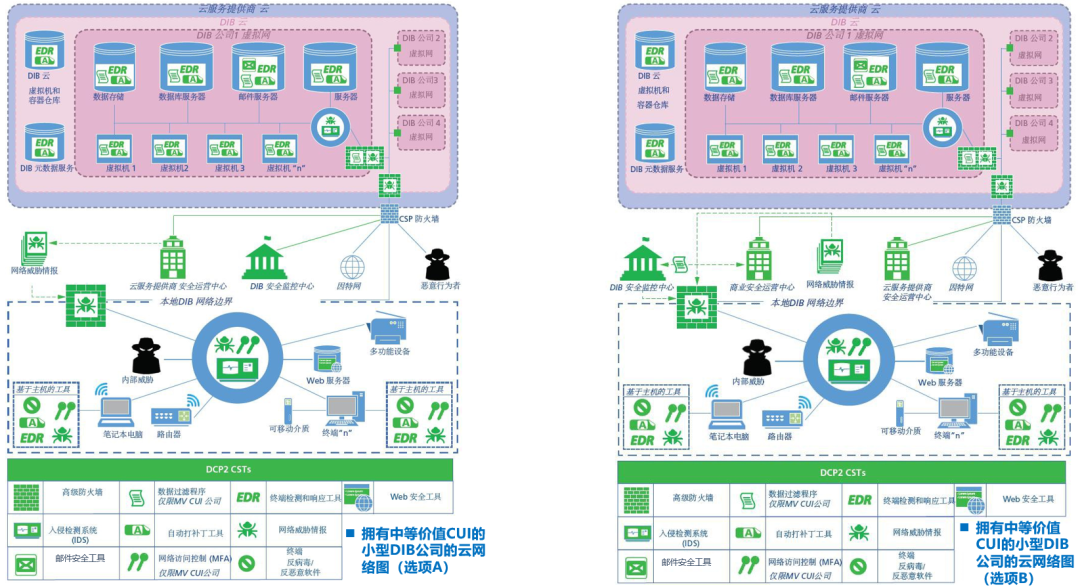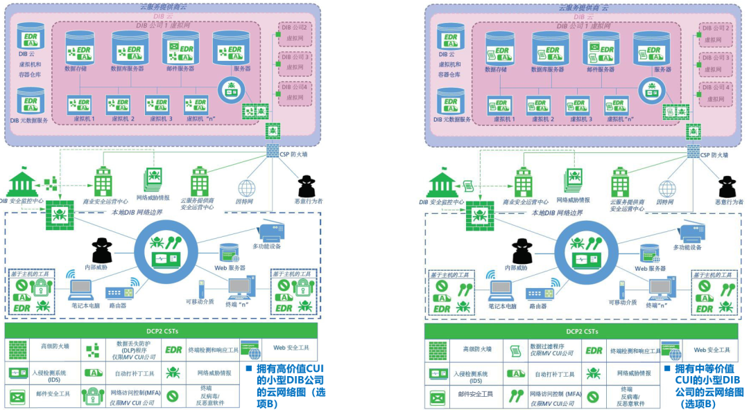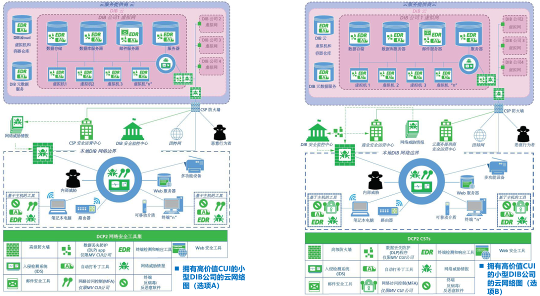 图7-大型公司(选项A):本地网络 vs. 云网络上面左、右两图的安全能力几乎是相同的,其主要差异在于是否上云。而上云情况下主要是由云服务提供商(CSP)提供对DIB公司云中飞地(其中包含邮件、门户网站等)的安全防护。![]()