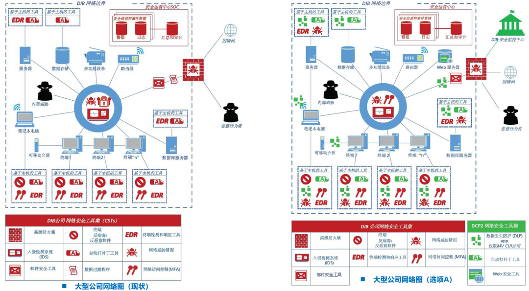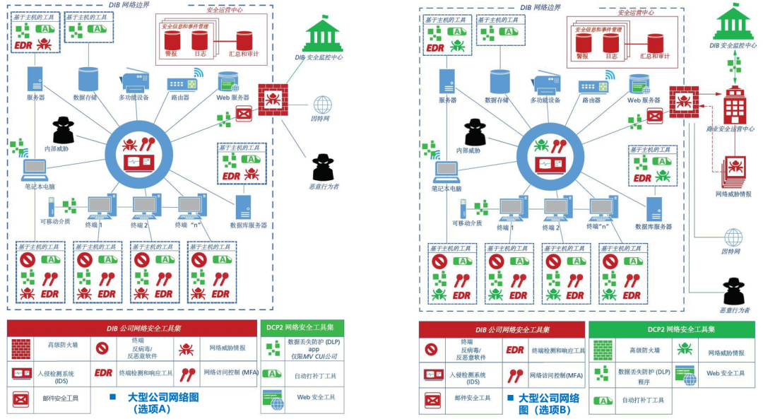 对于大型公司而言,由于大型公司通常已经自建了大部分的安全能力(见左图,以红色标记),故通过DCP2提供的安全能力(以绿色标记)并不多,主要是DLP、自动补丁、Web安全工具等(见右图,以绿色标记)。右图(选项A)中,还连接到国防部领导的DIB安全运营中心。
