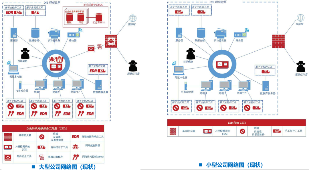 对于DIB小型公司:要么无法拥有足够的网络安全专业人员,要么无法维护全套的网络安全工具集(CST),几乎不可能同时拥有网络安全专业人员和全套的网络安全工具集(CST);