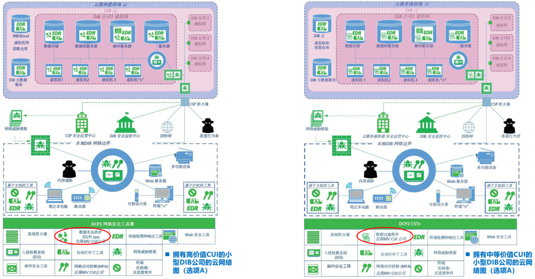 图9-小型DIB公司的云网络(选项A):拥有高价值CUI vs. 中等价值CUI该图的最大特色是,红色的自购安全控制全部消失,表明所有安全控制皆由DCP2计划提供(绿色标记)。上面左、右两图的主要区别在于:右侧的中价值公司采用了数据过滤程序;而左侧的高价值公司则采用了DLP(数据防泄漏),提高了安全标准。