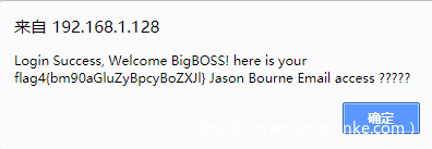 Login Success, Welcome BigBOSS! here is your flag4{bm90aGluZyBpcyBoZXJl} Jason Bourne Email access ????? (此处为:nothing is here 此处没有)