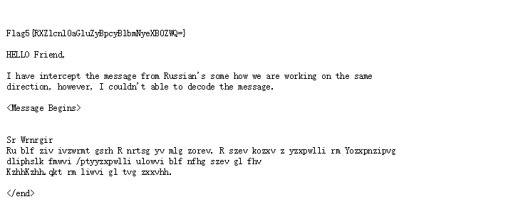 Flag5{RXZlcnl0aGluZyBpcyBlbmNyeXB0ZWQ=} (此处为:Everything is encrypted 一切都是加密的)