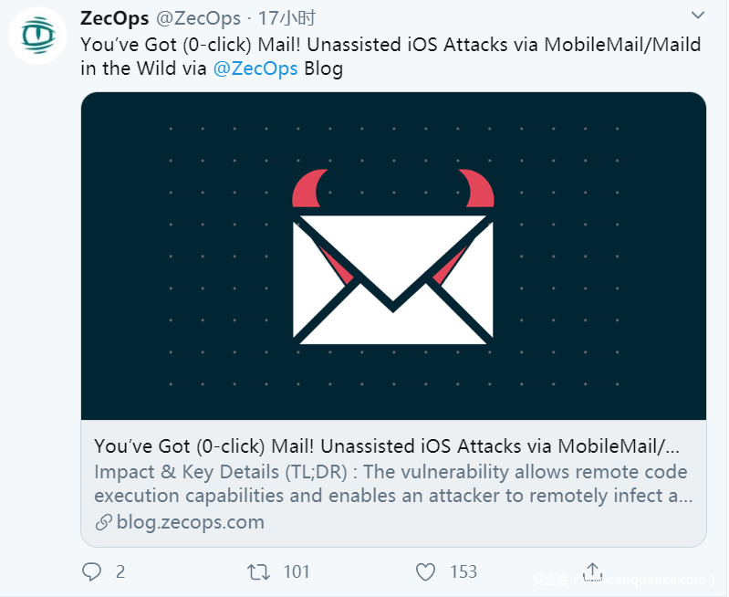 本周一,旧金山的一家手机安全取证公司ZecOps公开发布一则重磅报告,表示去年末在调查一起客户网络攻击事件时,发现:iPhone和iPad自带的默认邮件应用程序Apple Mail存在两个正在被在野利用的严重漏洞。