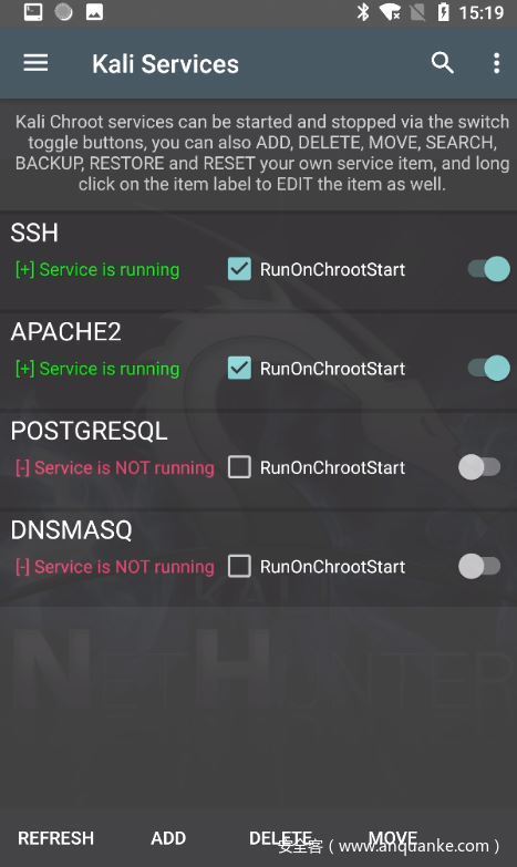 这回使用ssh不用再通过termux了,直接Nethunter应用中选择Kali Services,勾选RunOnChrootStart,并打开右侧开关: