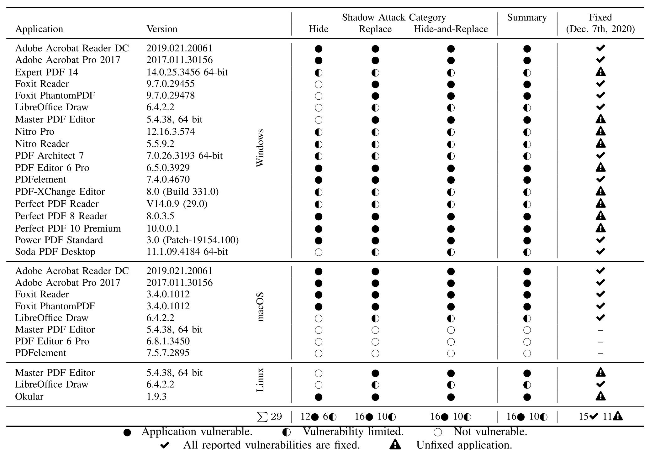 研究者在2021年2月22日的网络和分布式系统安全研讨会(Distributed System Security Symposium, NDSS)上公布了“影子攻击”方法。已测试的 29 个 PDF 应用中有 16 个容易受到影子攻击。测试的 PDF 应用包括:Adobe Acrobat、Foxit Reader、Perfect PDF 和 Okular。