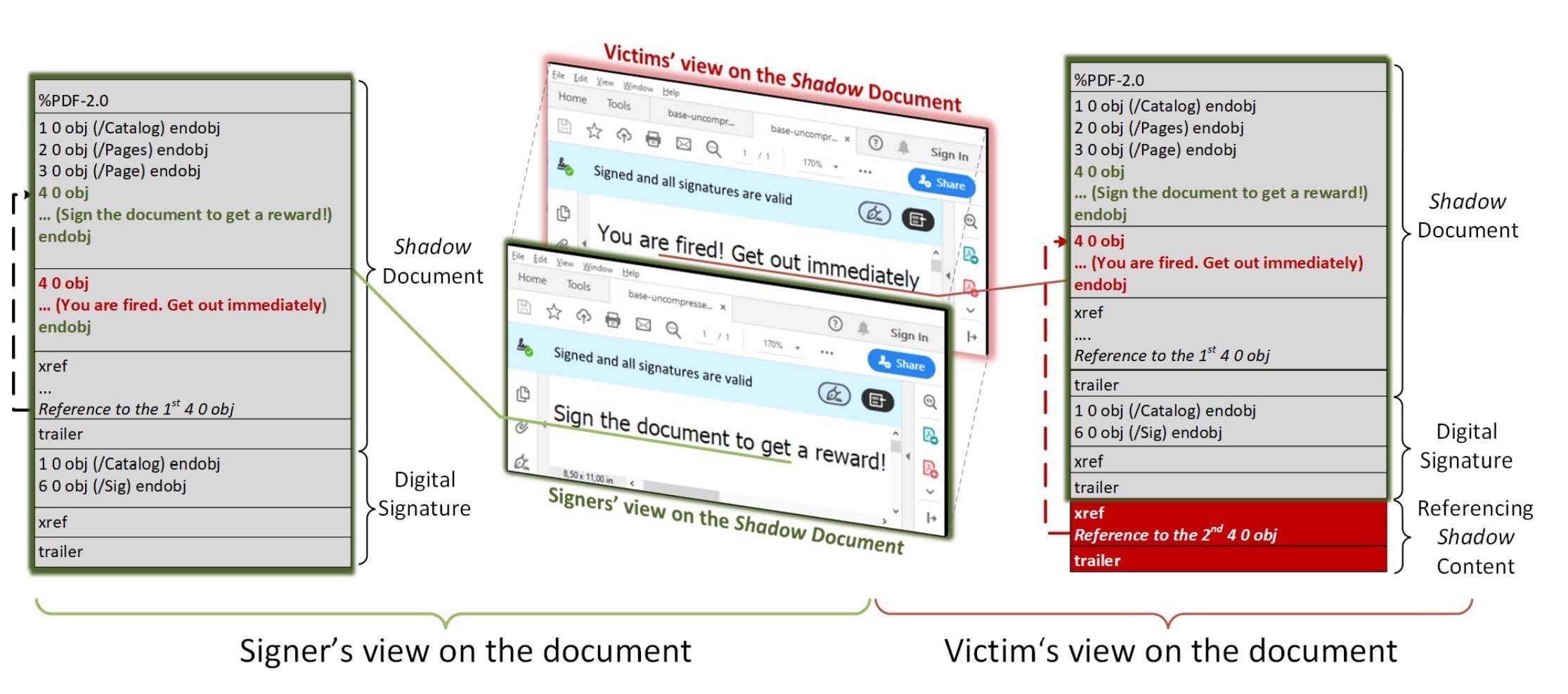德国波鸿鲁尔大学(Ruhr-University Bochum)的学者将这种攻击方式称为“影子攻击(Shadow attacks)”。“影子攻击”利用了 “PDF 规范提供的巨大灵活性,让修改后的影子文档依然符合标准”。