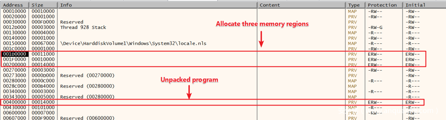 内存映射如下图所示,红框内为三块已分配的内存空间及解包的程序。