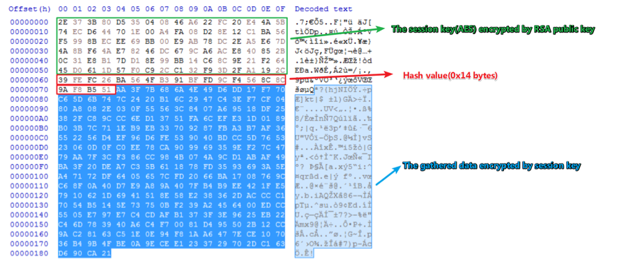 接下来,恶意软件用会话密钥对压缩后的数据进行加密,并将由RSA公钥加密的会话密钥(AES)、哈希值以及加密数据打包在一起,存放在接下来的结构中。