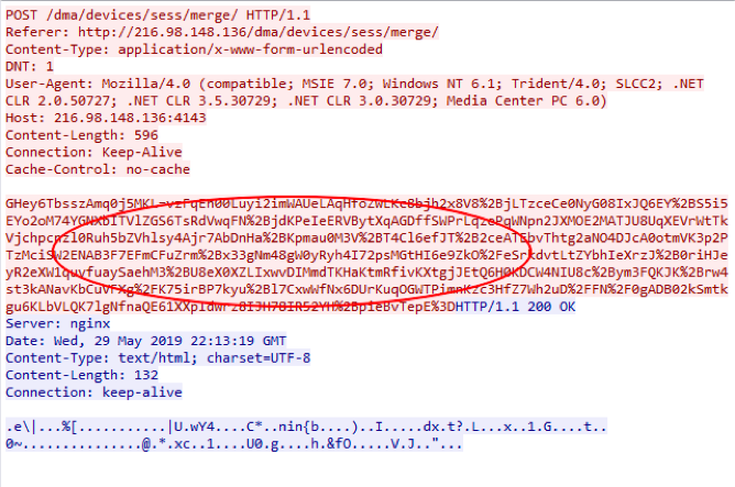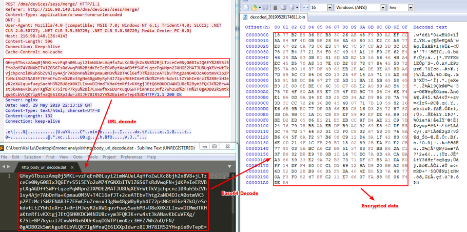 将这三个部分数据打包后,还要依次进行Base64编码和URL编码,才形成最终将要发送到C2服务器的http正文数据。