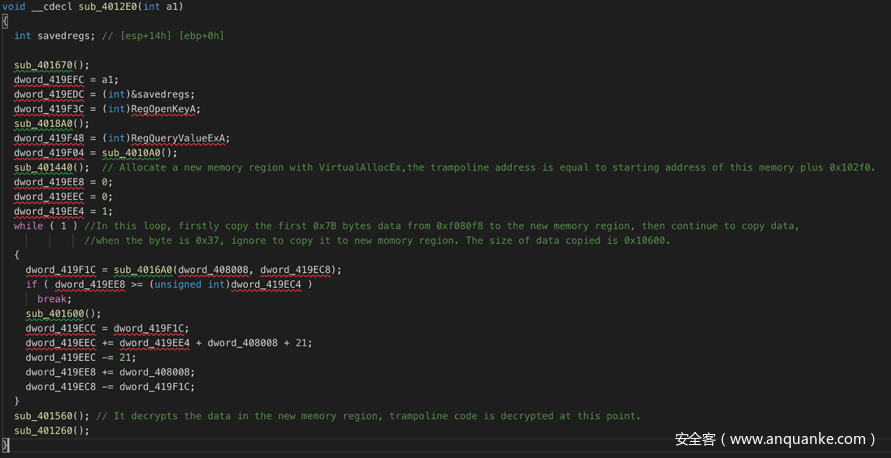 在此函数中,恶意软件调用了函数sub_401440()并使用VirtualAllocEx()分配了新的内存空间(0x1D0000),并将此内存的起始地址加上0x102f0设置为蹦床(trampoline)地址。