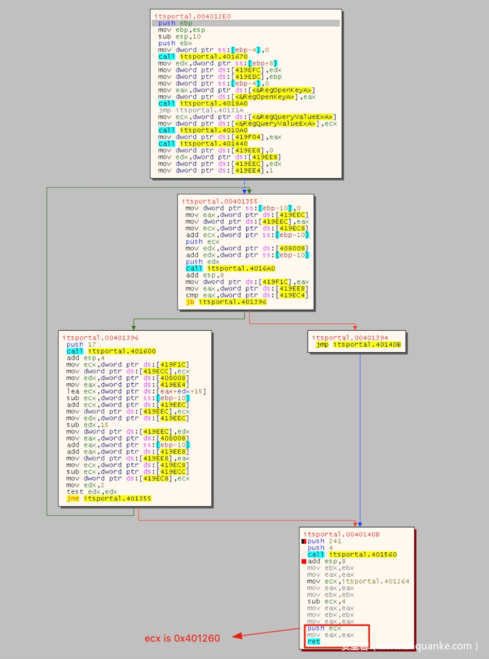 在本节中,我们将继续分析持久性payload itsportal.exe。这个payload使用了定制化的封包工具。从入口点跟踪几个步骤后,程序进入函数sub_4012E0()。