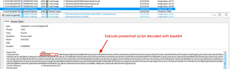 我们可以看到恶意Word文档文件中的VB脚本使用PowerShell创建了一个新进程。而’-e’参数表示可以执行经base64编码的字符串类型的命令。