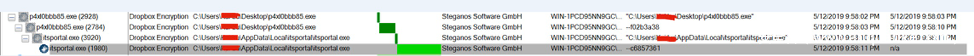 首先,它会使用命令’—f02b3a38’启动进程(pid:2784)。然后将PE文件’itsportal.exe’写入路径C: Users [XXX] AppData Local itsportal 。接下来,执行itsportal.exe(无附加参数)。执行后,使用命令’—c6857361’启动进程(pid:1980)。最后,退出前三个创建的进程,将PE文件p4xl0bbb85.exe从硬盘中删除。留下的PE文件itsportal.exe即为持久性payload。