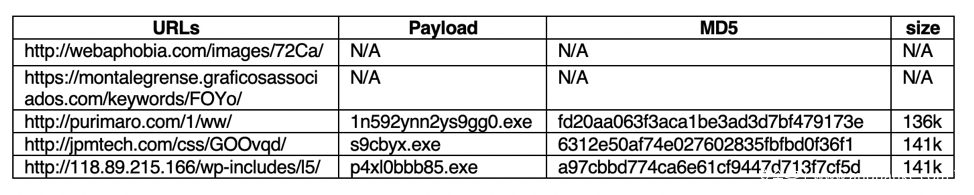 在我5月初开始跟踪此活动时,前两个URL已无法访问,而其余三个URL则处于活跃状态。(URL对应的payload均为PE文件)。