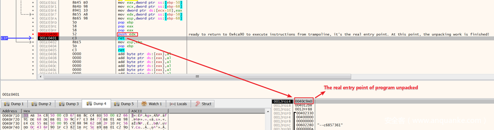 10.从蹦床地址跳回到真实入口点(0x4CA90)以执行指令。此时,已完成解包工作。