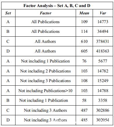在上面的表(基于每个Author的中Publication、基于每个Publication的Author)中,Author和Publication的数量为n,A,B,C和D四组的因素分析显示在下表及其在数据集中表示的每个Author和每个Publication的计算均值和方差。