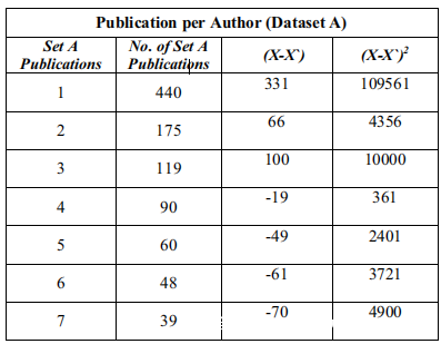 每个Author的发布统计信息是数据集范围的基本度量,方法是将数据集中Author的标识符按存在于它们中的总Publication和每个簇的大小进行聚类。这在上表中给出。要提供表中数据集的第1列中的值,指定该值。数据集中包含的1200个不同Author中的440个(== 37%)由第1列和第2列中的一个Publication准确引用。最初计算集合A和集合B的总体方差。