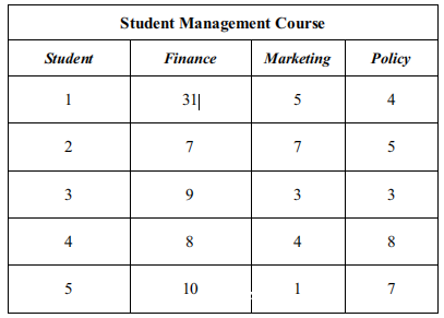 上表中的一个示例说明了因素分析。选择管理计划的学生必须选择金融,商业营销和政策等特定课程。令X1,X2和X3代表学生的课程成绩。以下数据由10分及格以上的5名学生的成绩组成。