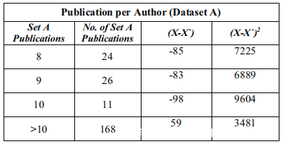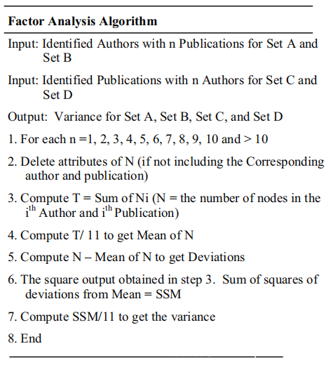 首先使用关键字“Publications per Author”对数据集执行因素分析。在这里,Author以n个Publication标识,n个假设值为1,2,3,4,5,6,7,8,9,10和>10。这显示在集合A中。平均值是109,方差是14773对于为不同Author标识的集合B,总节点为1257,几乎与集合A(1200)相似,均值为114,方差为34494。尽管均值相近,但集合B的方差大于集合B的两倍。对于集合A和集合B,载荷量为Publication数量。