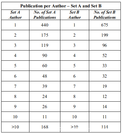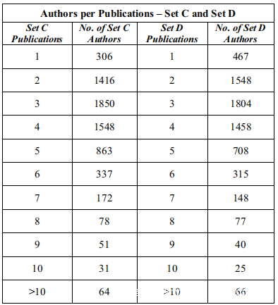 下面的表显示了Author的Publication之间的关系。有四组数据:A,B,C和D组。表III。指每个Author的Publication集A和B。鉴定为“ n”种出版物的Author。