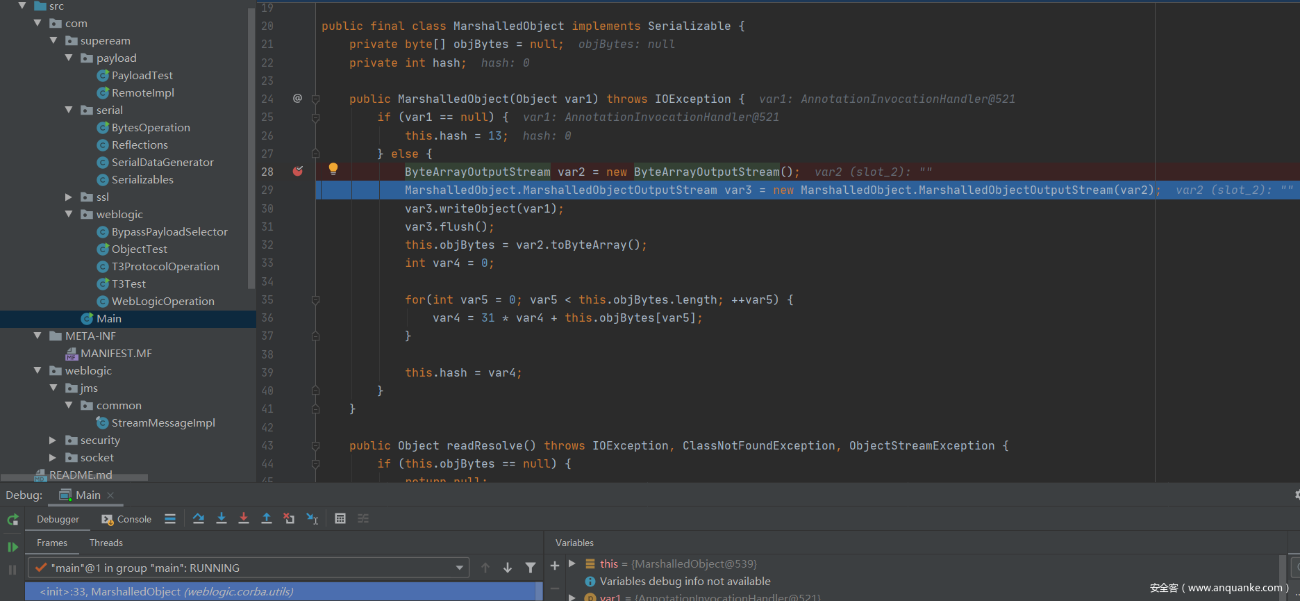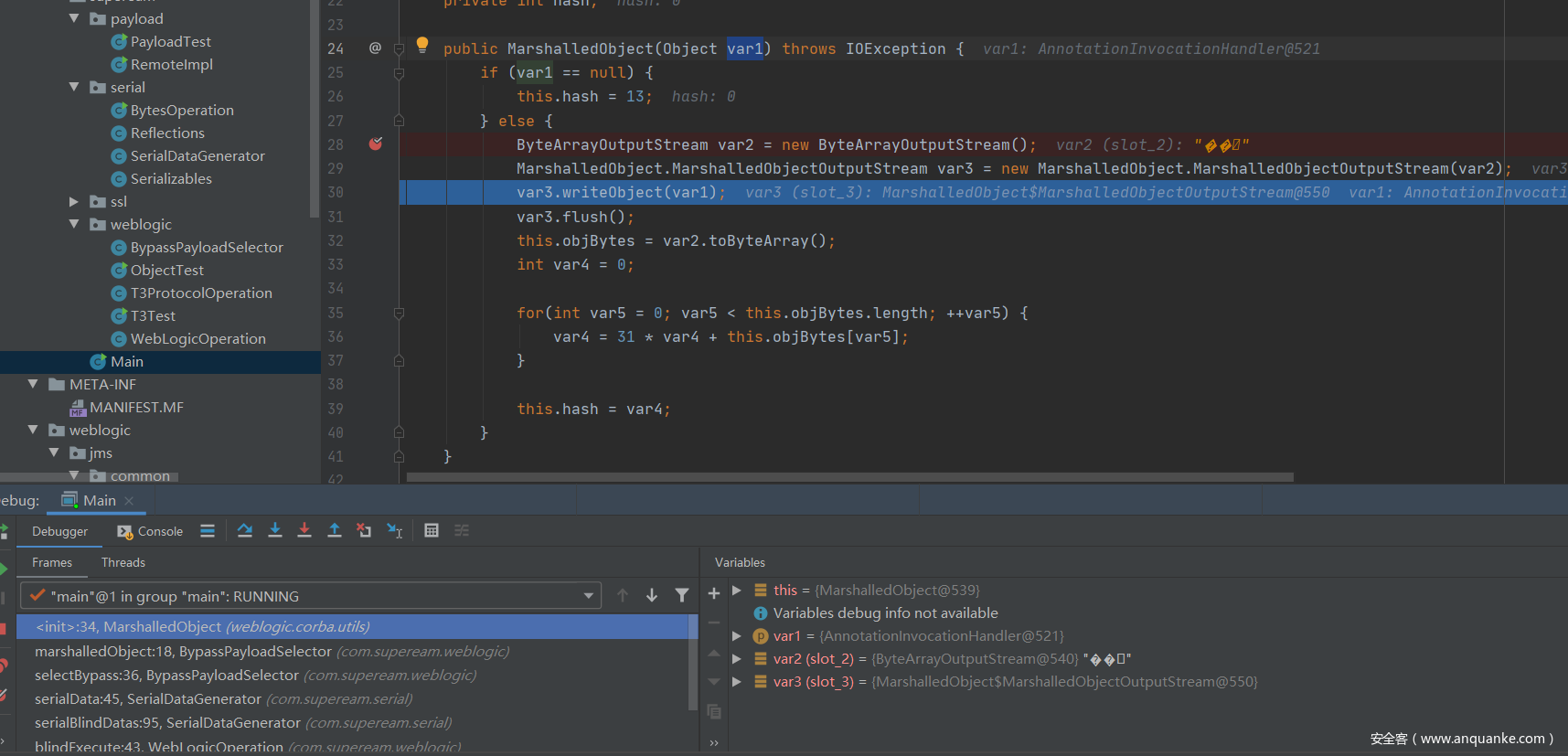 var1是我们传递进来的payload,在这里使用的是CC1的利用链,var1也就是一个恶意的AnnotationInvocationHandler对象。var2是ByteArrayOutputStream对象,var3相当于是一个ObjectOutputStream对象。在这里会将var1 的内容进行序列化后写入到var2里面。