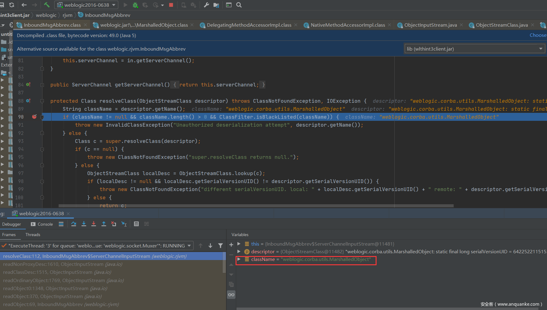 先在InboundMsgAbbrev.ServerChannelInputStream#resolveClass方法先打一个断点,payload发送完成后,在该位置停下。