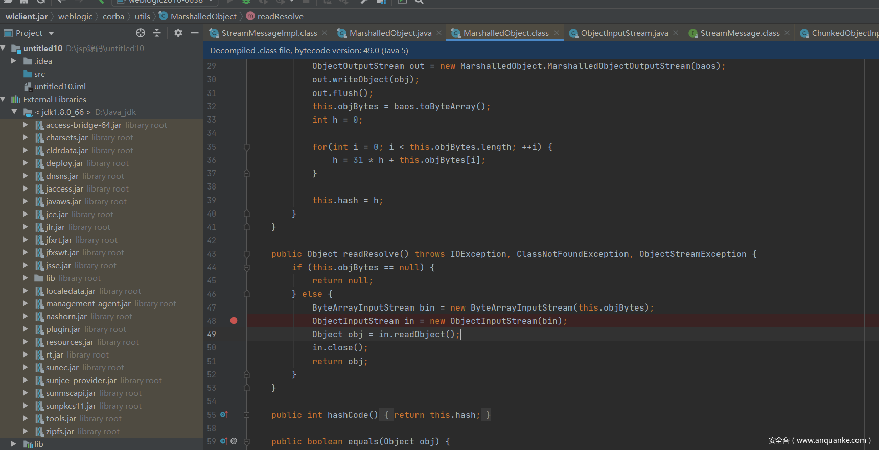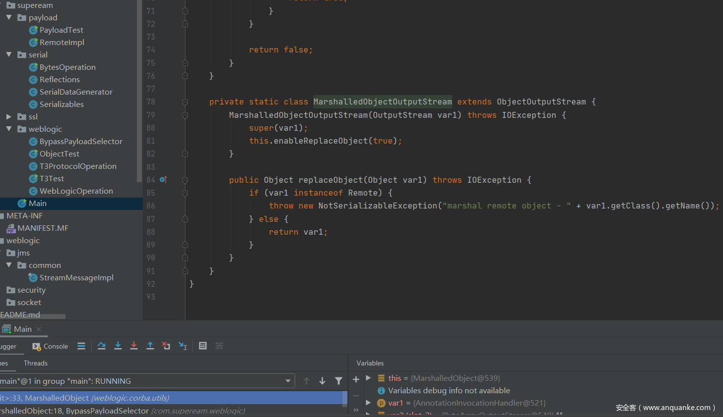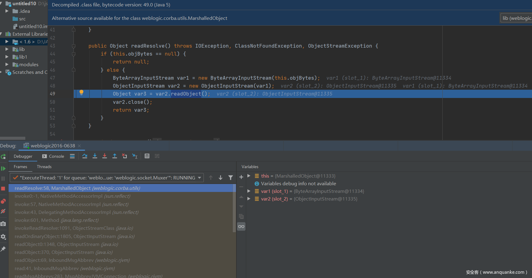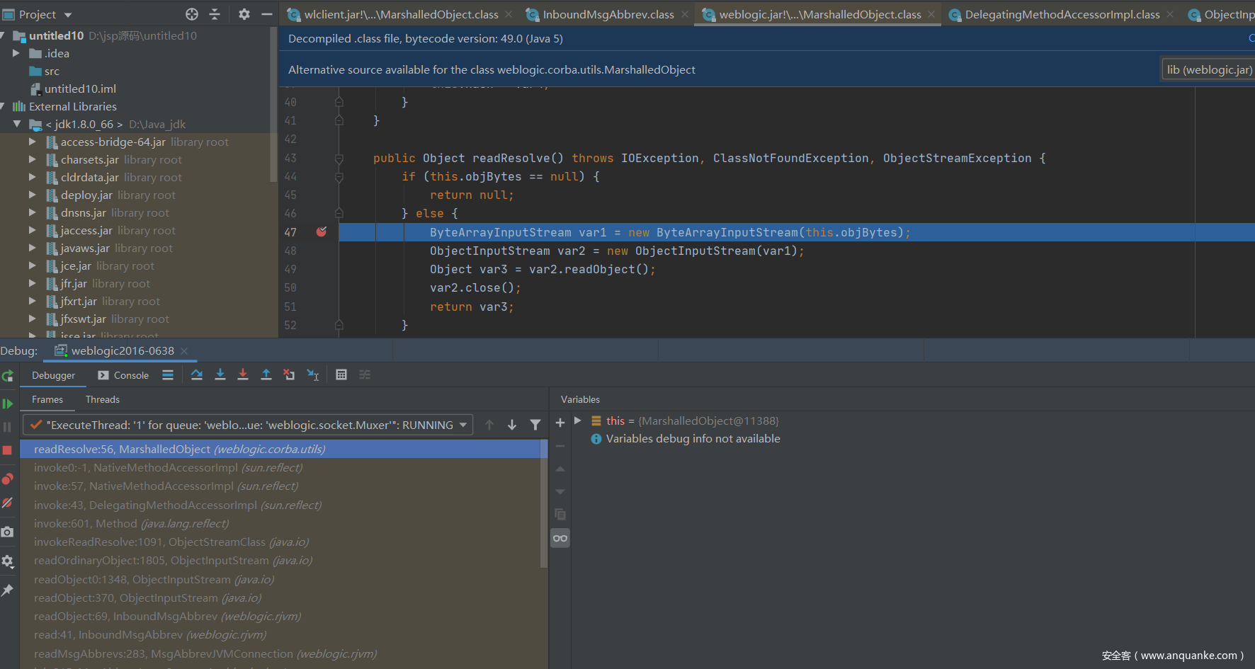 下面来直接看到weblogic.corba.utils.MarshalledObject#readResolve方法的位置