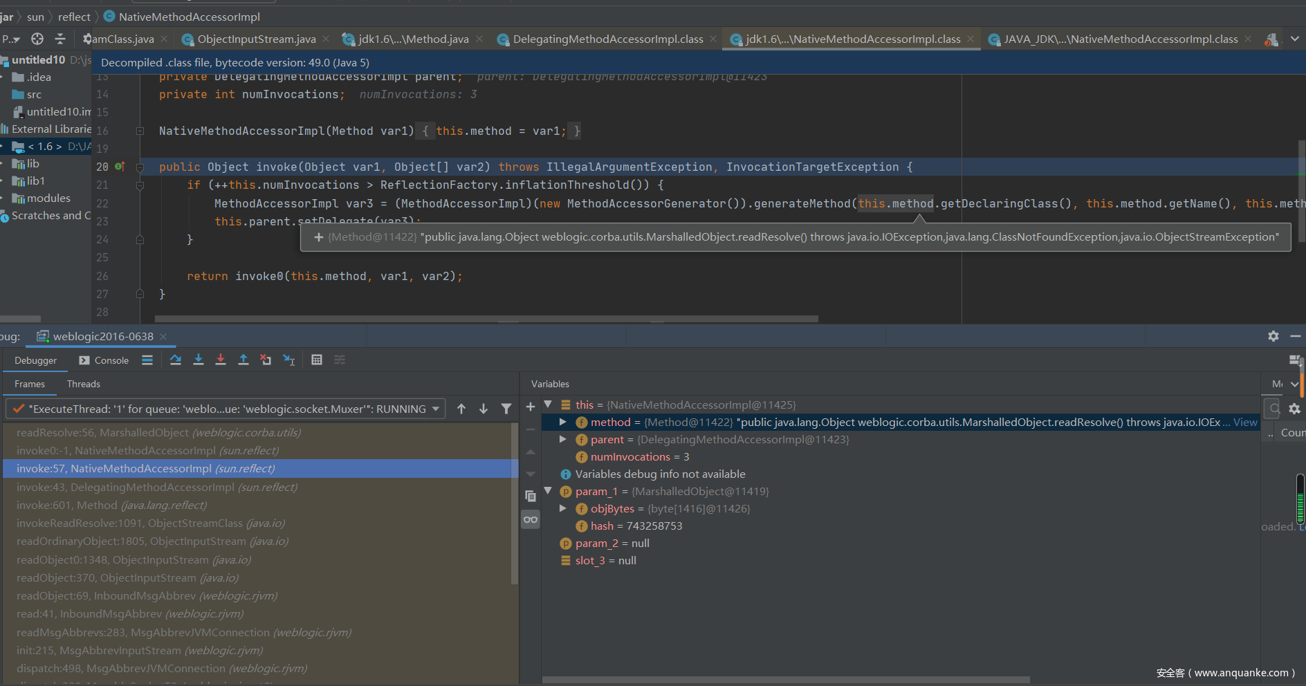 在Weblogic从流量中的序列化类字节段通过readClassDesc-readNonProxyDesc-resolveClass获取到普通类序列化数据的类对象后,程序依次尝试调用类对象中的readObject、readResolve、readExternal等方法。而上一个CVE-2016-0638的漏洞就是借助的readExternal会被程序所调用的特点来进行绕过。我们这次使用的是readResolve这个方法,这个方法也是同理。