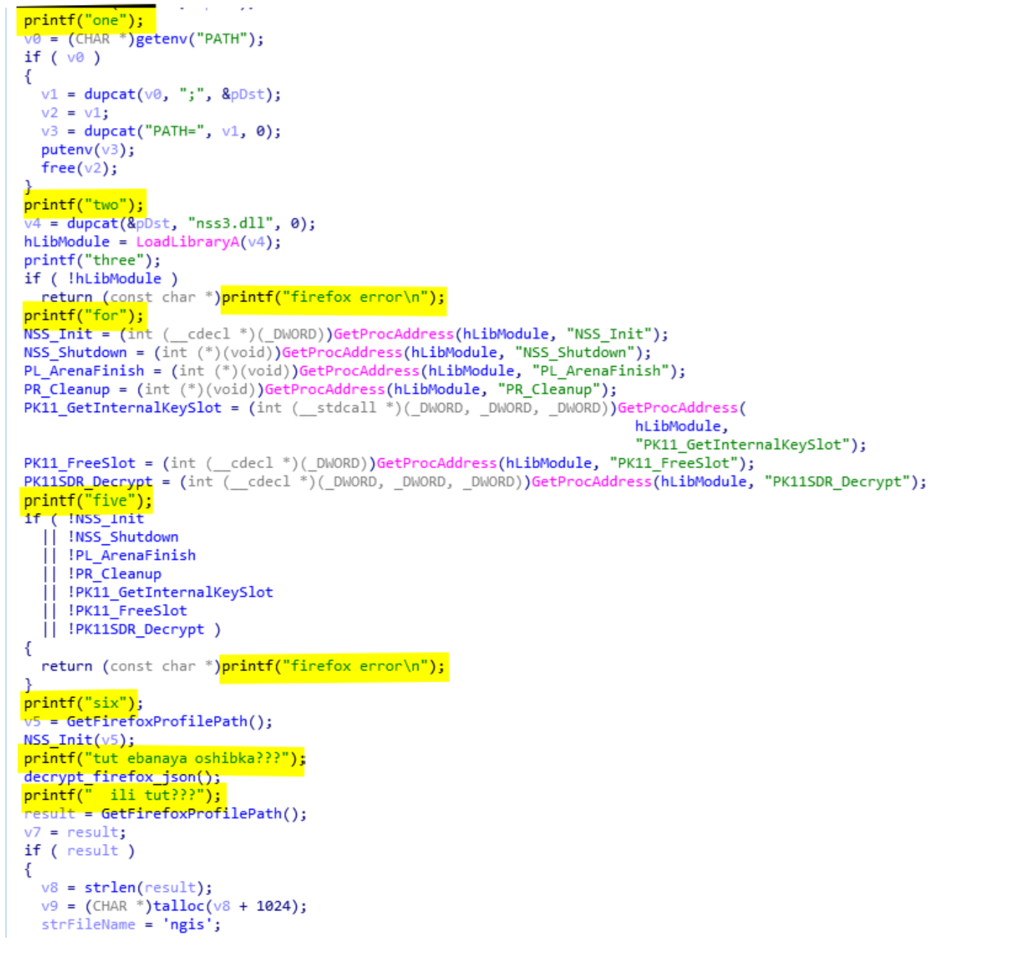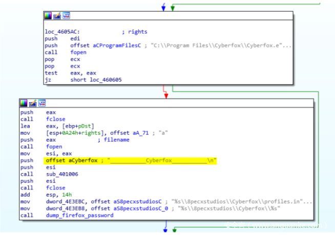 关于这个AcridRain样本,在日志中还有一个小彩蛋,我们在dump_firefox_password函数发现了这些:(如下图)。