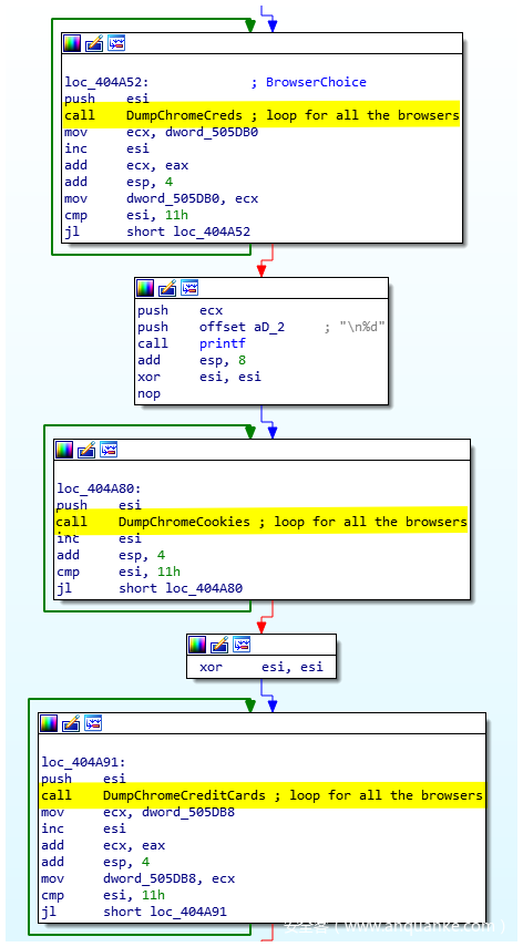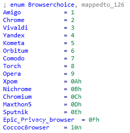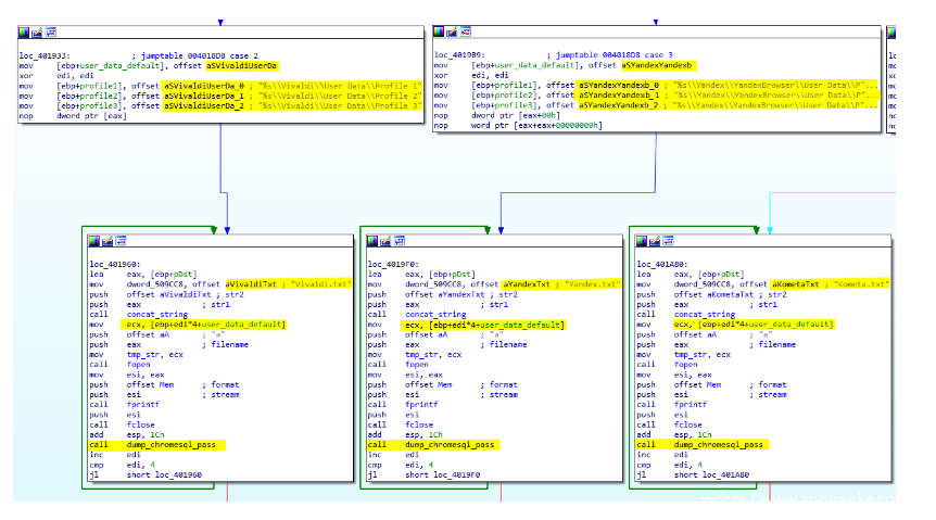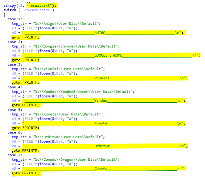 窃取证书非常简单。根据DumpChromeCreds (0x4017F0)的给定输入,恶意软件根据用户数据选择合适的目录。例如,如果输入0x1,那么恶意软件将使用目录 C:\ Users \ [USER] \ AppData \ Local \ Google \ Chrome \ User Data \ Default,如果是0x3,则它将是 C:\ Users \ [USER] \ AppData \ Local \ Yandex \ YandexBrowser \ User Data \ Default等。每个浏览器的值如下所示:
