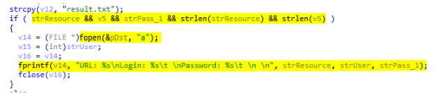 在上图中我们可以看到,sqlite3_exec通过回调来dump凭据。chrome_worker 函数(0x401400)用于从登录表中检索特定信息。恶意软件将保护origin_url,username_value和password_value字段的信息。密码使用CryptProtectData进行加密,因此要获取纯文本,需要使用CryptUnprotectData函数。若所有信息都窃取完成,会将其保存到文件中(如下图)