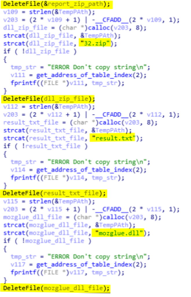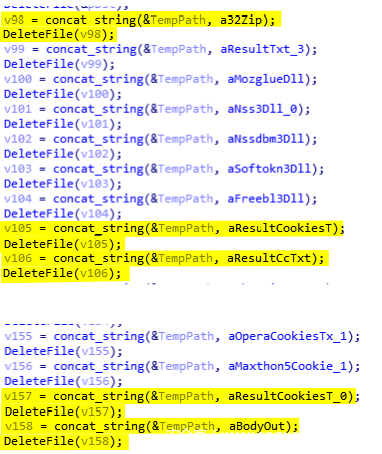 一旦数据发送完毕,恶意软件将删除所有生成文件然后退出,生成文件包括32.zip, result.txt, mozglue.dll, nss3.dll, nssdbm3.dll, softokn3.dll, freebl3.dll, result_cookies.txt, 和result_CC.txt.