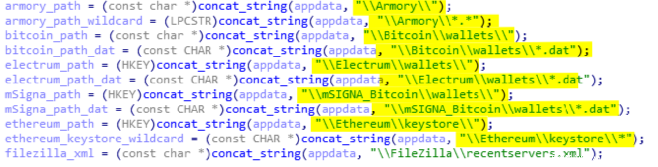 Dump完浏览器凭证后下一步就是窃取数字钱包。改恶意软件支持5种数字货币的窃取,分别为Ethereum, mSIGNA, Electrum, Bitcoin以及Armory。在0x404EEA处定义了这些数字货币的客户端路径,如下图: