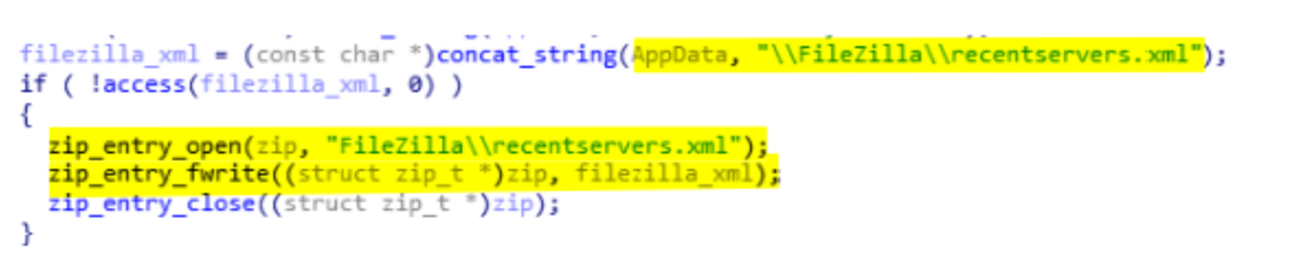 Filezilla是一个知名的FTP客户端。AcridRain的目标不是以保存的凭证,而是最近使用过的凭证。为了dump这些信息,它会保存Filezilla文件夹中recentservers.xml