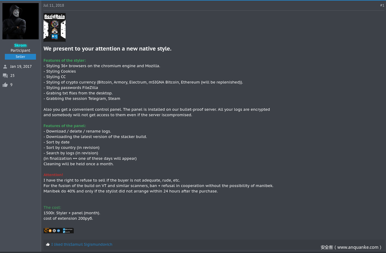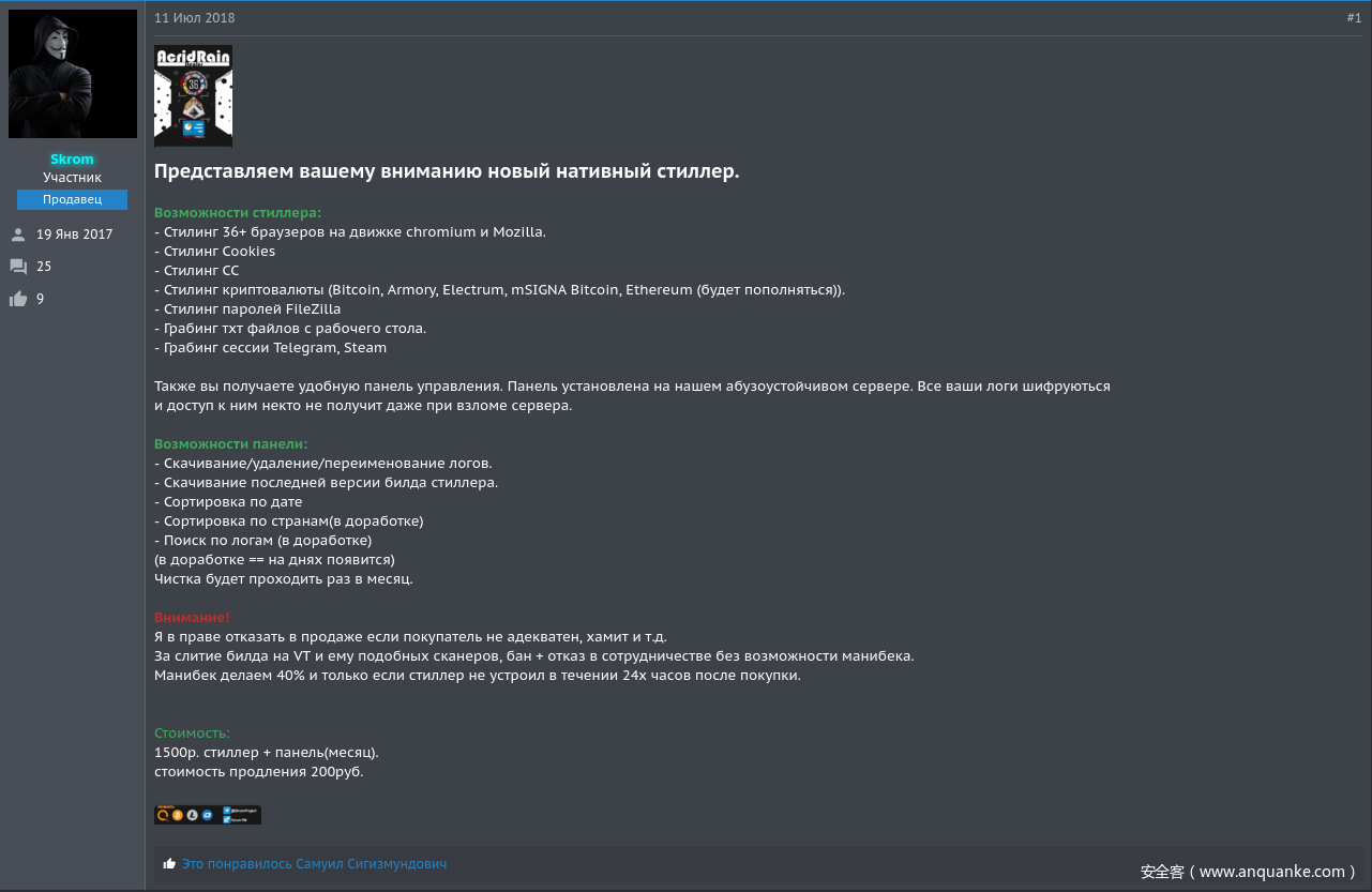 AcridRain是一款用C/C++编写的新型密码窃取软件,最早于2018年7月11日在黑客论坛出现。它可以从多种浏览器窃取凭证,cookies及信用卡信息。除此之外,还有转储Telegram和Steam会话、抢占Filezilla连接等功能。详细介绍见下文: