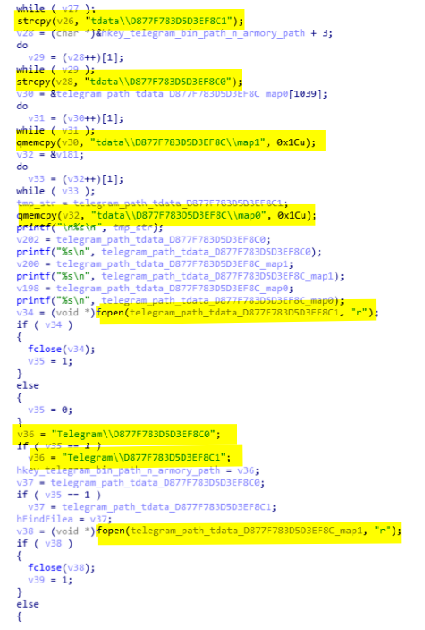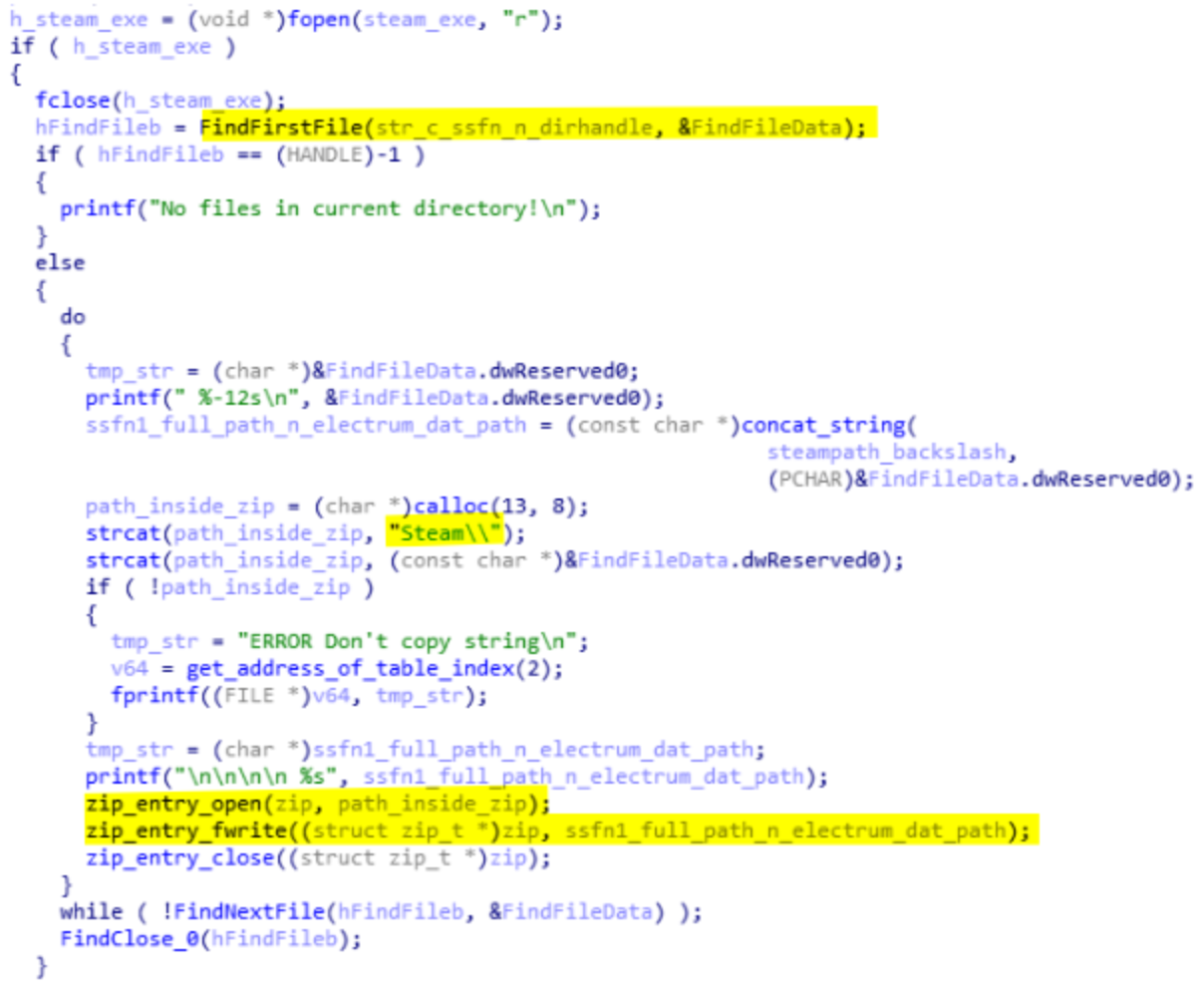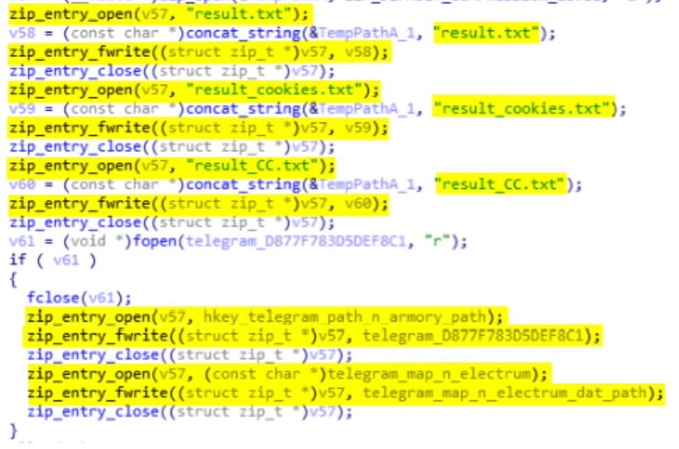Dump出所有凭证后,恶意软件会将所有txt文件和Telegram会话汇总压缩为ZIP文件。为了实现这个操作,它使用zip_entry_open函数指定zip中文件的名称和位置。例如,zip_entry_open(zip, “result.txt”) 会向根目录下的zip文件添加result.txt,zip_entry_open(zip, “Telegram\D877F783D5DEF8C1”)将在Telegram目录中创建名为D877F783D5DEF8C1的文件。然后使用zip_entry_fwrite函数将指定文件写入ZIP(如下图)