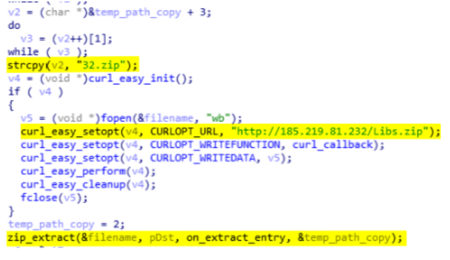 窃取Firefox凭据的函数DumpFirefoxCreds (0x403600)是对browser-dumpwd项目POC代码借鉴后再进行轻微修改得到的。恶意软件首先会从C2服务器下载额外的库文件,这些DLL来自Mozilla,用来解密Firefox中的凭据信息。作者用libcurl 7.49.1来连接服务器,所请求库文件放在C2服务器的根目录下,是一个名为Libs.zip的ZIP压缩包。下载后将位于%TEMP%目录,并更名为32.zip(如下图)