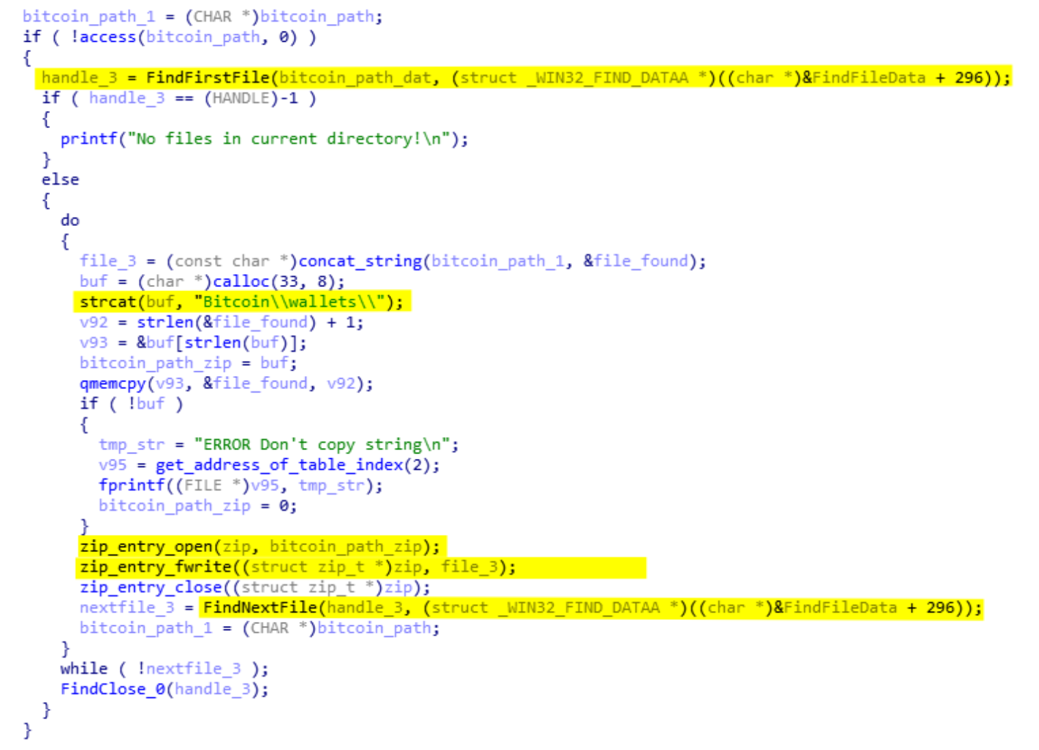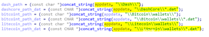 这个过程清晰明了,AcridRain对每个客户端文件夹进行迭代查询,寻找诸如*.dat的文件。下面是负责从比特币客户端窃取钱包地址的代码。