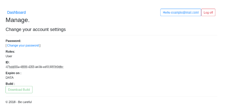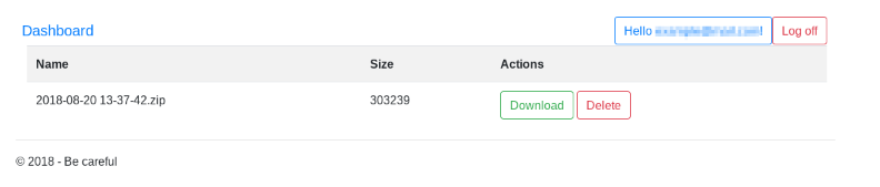 然后,登录后,您将被重定向到Dashboard。此页面用于下载和删除AcridRain上传的zip文件(见下文)