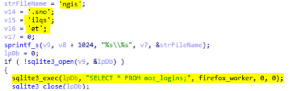 一旦从json中dump出凭证,就会执行回调firefox_worker (0x404180)中的查询语句SELECT * FROM moz_logins对SQLite 数据库进行查询。