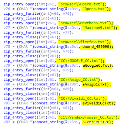 恶意软件对Chrome窃取功能进行了修改,现在,它不仅窃取默认配置文件,还改变了存储信息的方式,在之前的版本,所有数据被存储在三个独立的文件夹,分别为凭据,cookies和信用卡。现在它们存储在含有浏览器名称的唯一文本文件中(如Vivaldi.txt,Vivaldi_Cookies.txt和Vivaldi_CC.txt,如下图)
